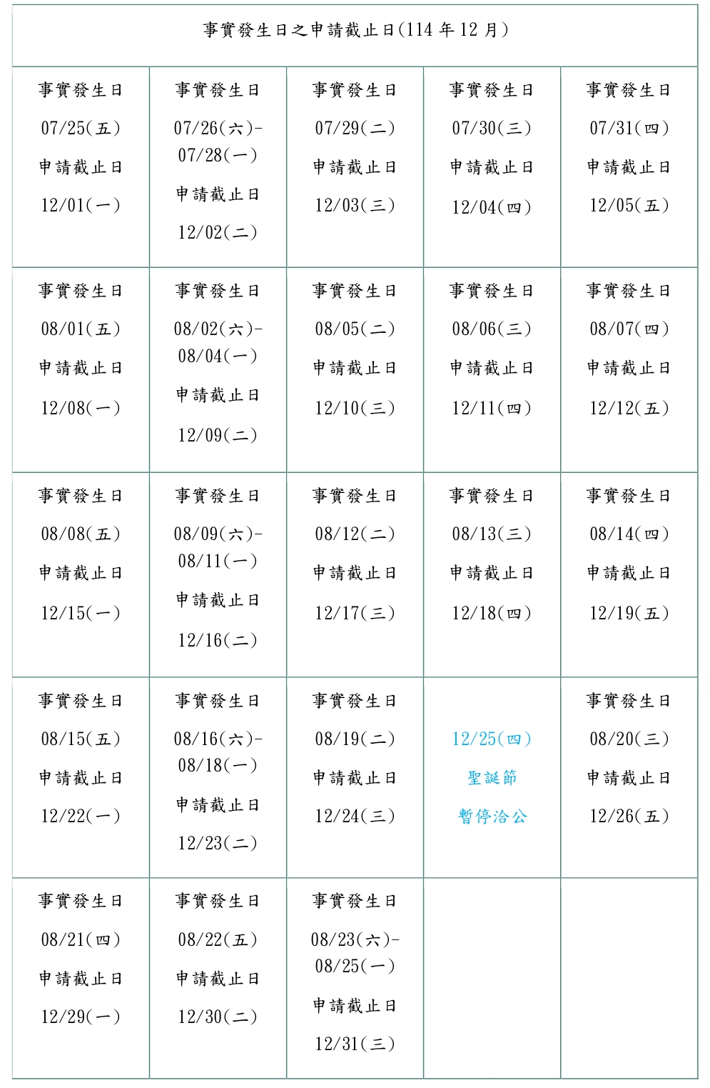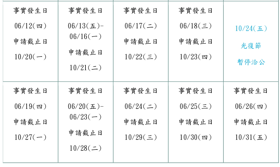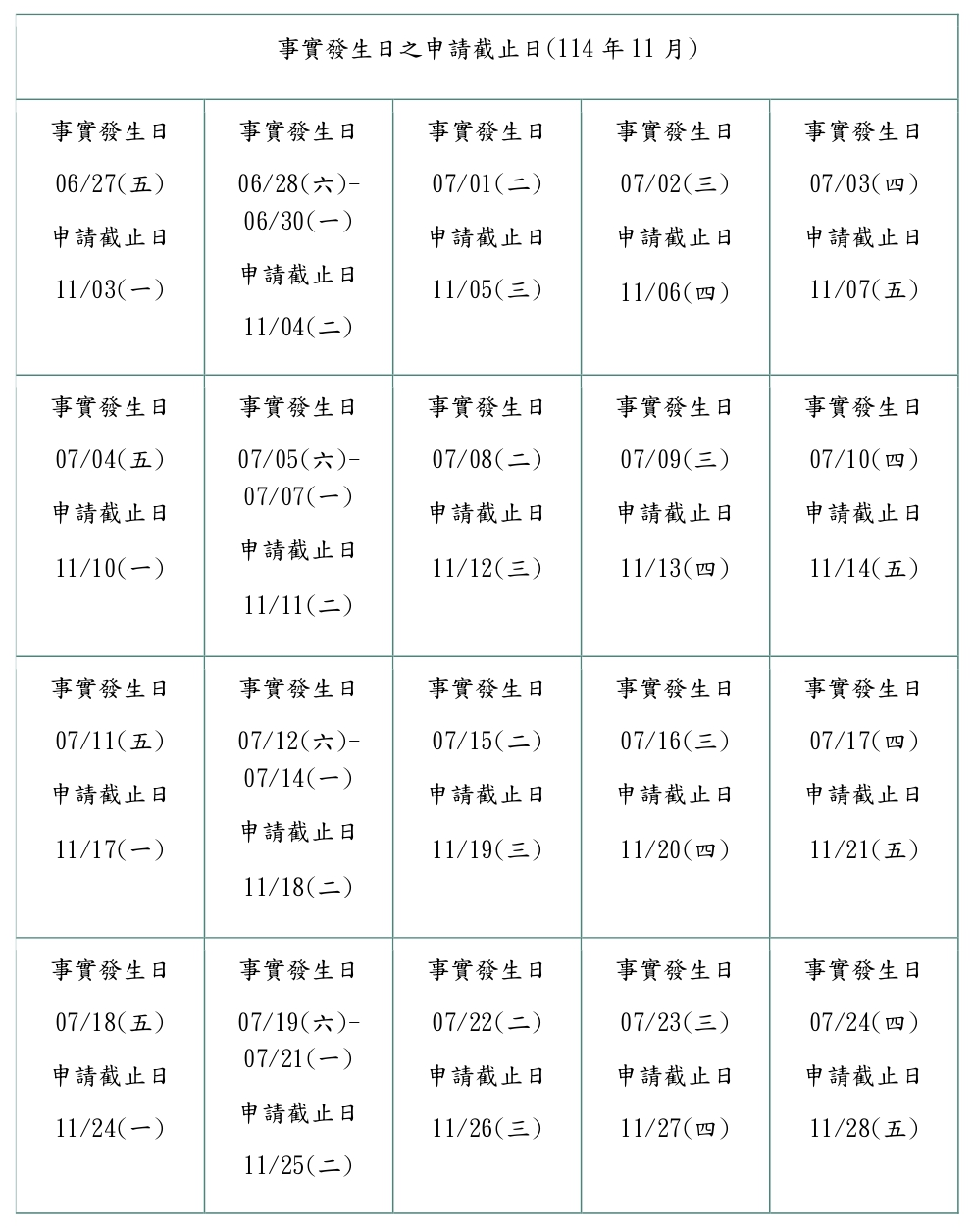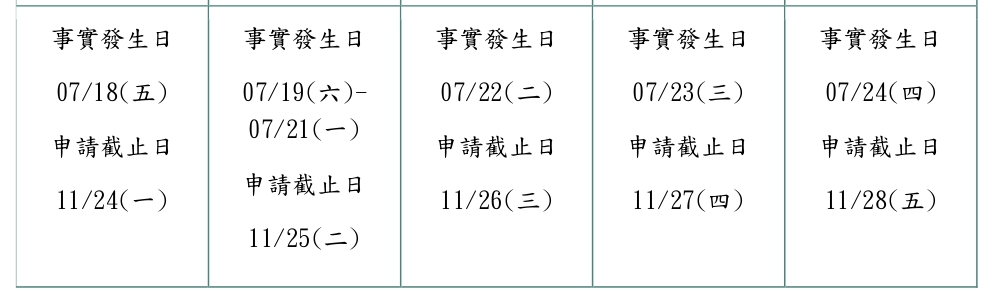 3.113/12/2週一起恢復依循本辦法規範之申請期限,請參考下表
