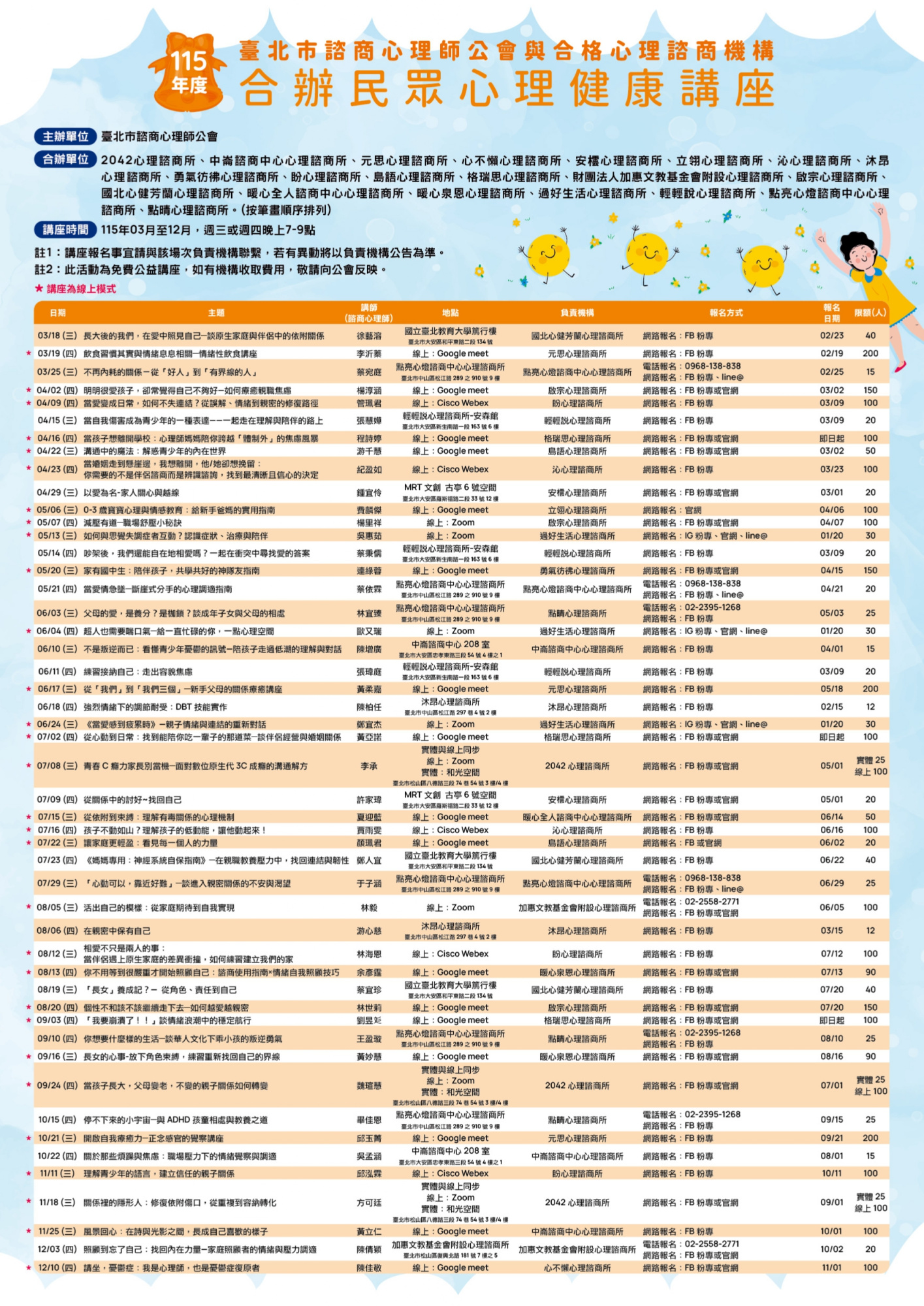 【公會訊息】115年公會與合格心理諮商機構合辦民眾心理健康講座DM
